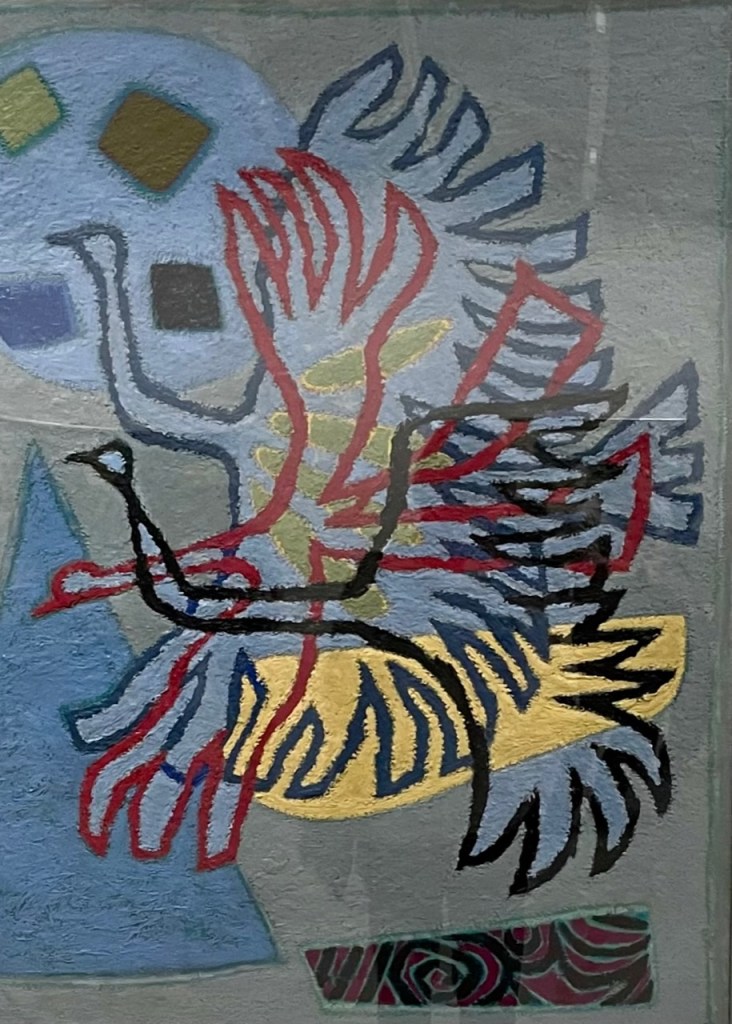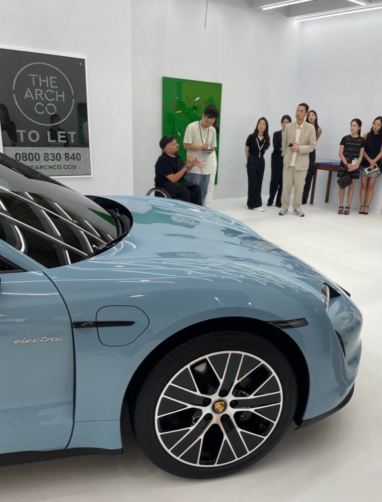 The artist is talking from his wheelchair. The artwork is a mosquito – can you find it? Hint: enlarge the bonnet of the car!
